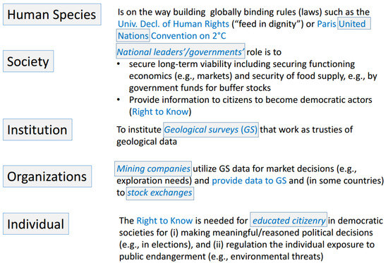 Not only do institutions have a right to know; under special conditions, individuals do as well, which we will discuss in the next section. We consider the individual citizen’s right to know about the accessibility of important and essential (i.e., non-substitutable) mineral materials as a cornerstone of society’s supply security. Figure 5 presents the interplay of activities and regulatory mechanisms among key actors as a prerequisite of long-term supply security.