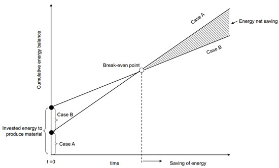 Insulation materials consist of raw materials, such as glass for triple-glazing instead of double-glazing, or rock wool for the improved insulation of walls, coming from primary or secondary sources. The production of these materials requires energy. Investment in energy and non-energy materials can improve energy efficiency. Schematically in Figure 8, two cases for insulating buildings are compared. Case A is the standard case. Case B benefits from a greater investment in insulating materials such as additional window glass or rock wool. The diagram in Figure 8 shows the cumulative energy balance over time. Of course, the energy input for building and insulating materials occurs only at the fabrication and construction stage and stays constant from t = 0 onward. In the diagram for a cumulative energy balance, we have to add the energy used for heating, being zero at the beginning (t = 0) and rising over time. Because case B is better insulated, the consumption line is flatter and intersects at a certain point of time with the steeper consumption line of the base case A. The point of intersection is the break-even point for cases A and B, i.e., at this point in time, the additional energy invested in the production and installation of additional insulating material has been recovered through savings in using energy to heat. From the break-even point onward to the right, the total cumulative energy balance is reduced (hatched area) [64]. If we now add secondary material for glass, for example, we can save more energy und reduce the CO2-impact. The melting point for glass is lower than for the raw material quartz sand, meaning the break-even point in Figure 8 moves to the left. Glass production also requires calcium carbonate with the consequence of CO2 emission. Using secondary material, no additional carbonate, i.e., carbonate emission is necessary.