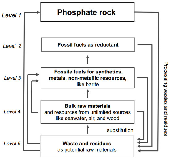 The recycling of phosphorus for fertilizing purposes is still not economic, with the exception of the manure route and some extraction of struvite with some methods (if the gains of extraction in the drying process of a sewage plant are taken into account). Therefore, if we compare phosphate fertilizer production from primary rock phosphate to secondary production from sewage sludge and take the hierarchy of natural resources of Figure 7 into account, we have to invest more chemicals from the raw materials at Level 2 and more energy from Level 1 [82,83] to save primary phosphate deposits. A critical issue is that phosphate is currently a low-cost commodity. Given a price of 200 USD per ton of phosphate rock granulate, each world citizen annually pays only 6 USD for mineral P, whereas an approximate 600–700 USD is paid for energy [51]. Thus, there are very low economic incentives for recycling.