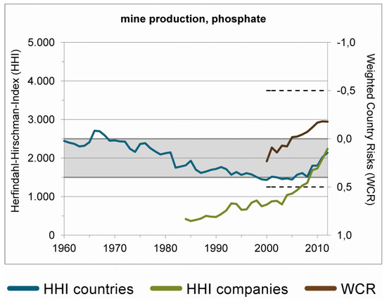 The Herfindahl–Hirschmann-Index (HHI) concentration index of phosphate-rock mine production for producer countries and producer companies and the weighted country risk (WCR), derived from the World Bank World Governance Indicator [87] (with permission of the DERA, Deutsche Rohstoffagentur). (The grey area is the area of average concentration, considered uncritical).