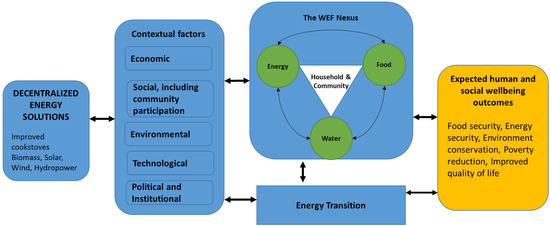 DES are a means of energy provision for households and communities affecting the WEF Nexus, but also a tool for energy transition. The WEF Nexus, adoption of DES, and energy transition are affected by common contextual factors that could be broadly categorized as economic, social, environmental, technological, policy-related, and institutional. Economic factors refer to financial and market aspects, including resource scarcities and relative factors prices, which influence the adoption of DES, energy transition, and the externalities of the WEF Nexus’ interactions. Social factors refer to cultural and social dimensions affecting energy and water use, food systems, their interactions, as well as people’s knowledge of the use and perceptions of DES. For example, as highlighted earlier, community participation often plays a key role in DES adoption. Political and institutional factors encompass the regulatory and political, as well as institutional aspects. Environmental factors refer to biophysical factors, such as climate, agro-ecologies, and soils affecting DES, energy transition, and the WEF Nexus through shaping relative resource scarcities [11,15]. Such broad categorization also allows for the implicit inclusion of numerous specific factors such as access to markets, access to rural advisory services and credit, land tenure security, the existence or lack of property rights to water, etc. under these broad categories [47].These contextual factors were identified based on the reviewed literature. These contextual factors and their various interactions serve either as catalysts or barriers for DES adoption and energy transitions, and also shape the tradeoffs and synergies within the WEF Nexus, with significant impacts on the outcomes in terms of human and social wellbeing identified through food security, energy security, poverty reduction, environmental conservation, and the improvement of quality of life for rural households and communities. These outcome variables were selected to highlight the WEF Nexus’ priorities, which seek to enhance food and energy security, environmental conservation through increased resource use efficiency, as well as the expected implications of energy transitions on poverty reduction and human health (e.g., through lower indoor air pollution). The relationships between DES, contextual factors, energy transition, and the WEF Nexus are, in most cases, expected to be endogenous, i.e., with multiple feedbacks; hence, they are depicted with two-sided arrows.