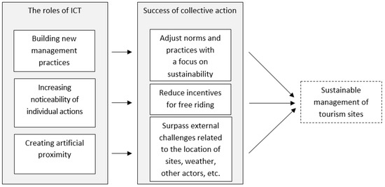 Our data suggests that ICT can be employed as a management tool which has the potential of playing an important role in the sustainable management of tourism. In particular, our analysis reveals three distinct roles ICT assumes in collective action, (a) building new management practices; (b) increasing noticeability of individual actions; and (c) creating artificial proximity. Drawing on collective action theory and social informatics, we suggest that the use of ICT tools influences the success of sustainable tourism management by facilitating collective action to adjust norms and practices with a focus on sustainability, reduce incentives for free riding and surpass external challenges related to, e.g., the location of sites, weather or the presence of other actors. Figure 2 summarizes these findings.