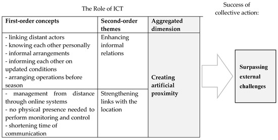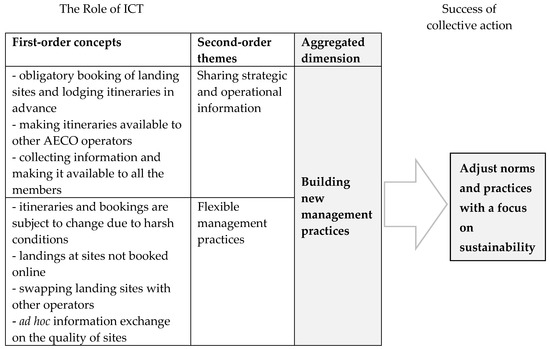 The roles played by ICT in a collective-action context (see Figure 2) are undeniably linked, but for the purposes of clarity in our discussion, we address each of these roles separately in this section. The figures we developed to summarize our findings include, on the left a description of the specific role of ICT in tourism management (in response to our sub-question 1, and on the right an assessment on how ICT contributes to the success of collective action (i.e., our sub-question 2). Our exploration of the roles of ICT (i.e., sub-question 1) follows Gioia et al.’s (2013) [68] approach using first-order concepts, second-order themes and subsequent groupings referred to as “aggregated dimensions”.