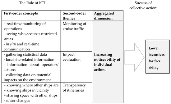 ICT also plays a role in relation to free riding, which is a common problem of collective action [21] and represents individual behaviours not complying with commonly established norms [28]. If opportunities for free riding exist, at least some of the actors will be tempted to utilize them and pursue individual benefits while not contributing to the collective efforts [16,28]. Opportunities for free riding decrease as information asymmetries are reduced, i.e., as transparency of actions taken by individual network members increases. In AECO, such increased noticeability is enabled by ICT, most notably through the monitoring of cruise traffic, the evaluation of impacts, and awareness about other operators’ itineraries (see Figure 4). The noticeability of individual network members’ actions is increased through real-time monitoring of cruise vessels, and it is possible to report those who do not comply with existing rules, e.g., by accessing restricted areas.