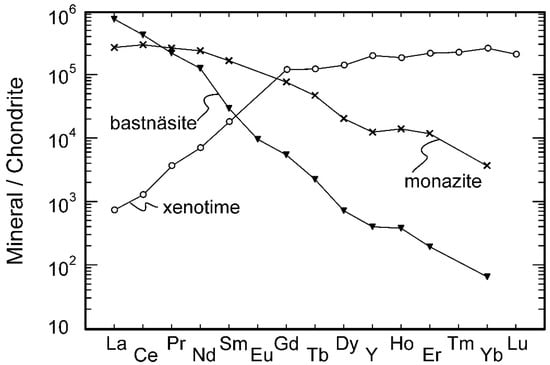 REE-bearing minerals tend to be dominated by either LREE or HREE, although each REE can be present. In some mineralized zones, the abundances of REE-bearing accessory (ore) minerals can reach >10 vol %. In alkaline igneous complexes, mineralization is commonly composed of a variety of REE-bearing minerals, which can exhibit complex replacement textures in part due to late magmatic to hydrothermal overprinting of the primary mineralogy, commonly producing pseudomorphs of pre-existing phases. However, there are only a relatively small number of REE minerals, which can be economically exploited. They include bastnäsite, monazite, xenotime, synchysite, loparite, eudialyte and parasite (Table 1). Overall, the bulk of resources is mostly associated with three REE-rich minerals: bastnäsite, monazite and xenotime (e.g., [3,4]). Bastnäsite and monazite are dominated by LREE whereas xenotime is the main source of HREE and Y (Figure 1). Many other accessory/ore minerals are either sparse or it is difficult to extract REE from them on a commercial scale. In alkaline igneous rocks, the grain size of the ore minerals in REE mineralization varies from coarse grained (commonly cumulate phases in the nepheline syenitic complexes) to fine grained in volcanic rocks and replacement textures.