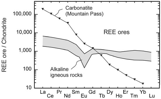 Chondrite-normalized REE patterns of an average ore of Mountain Pass (California, USA), a major carbonatite-hosted REE deposit [1,9] and the range of the average ores of the REE deposits associated with alkaline igneous rocks (Thor Lake, Strange Lake, Kipawa, Norra Kärr, and Bokan). The data are from Hatch [12,13]. Normalizing values are after Sun and McDonough [10].