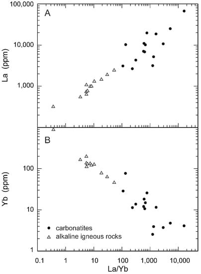 The variations of La and Yb (ppm) relative to La/Yb ratios in REE ores of carbonatites and alkaline igneous rocks. Most data reflect the average grades of the REE ores in the deposits and exploration projects reported by Hatch [12,13].