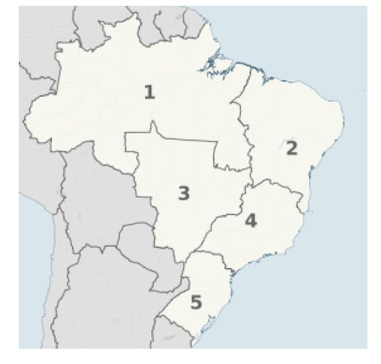 Brasilianregions (1—North; 2—Northeast; 3—Centre west; 4—Southeast; 5—South).