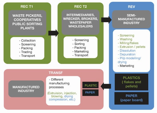 The re-valuation and transformation of recyclables is an economically viable activity, dependent on the continuous supply of material and on the availability of appropriate technologies, economically viable techniques to treat the different materials found in the waste []. These conditions might vary not only for different materials, but also for different Brasilian region. Plastic and paper recycling chains have some common characteristics regarding the production link. The occurrence of non-homogeneous products of different quality characteristics, such as color, the degree of impurities, and compaction, greatly influence the price and can define the interest in acquiring the material. In addition, the added value is very small, which makes the cost of transport very relevant.