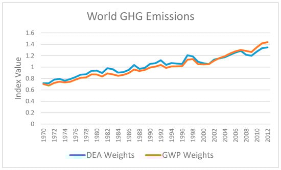 We have applied the procedures outlined in Section 4 to the World Bank greenhouse gas emissions data described in Section 3 to calculate world and country greenhouse gas composite indices based on DEA weights, and we compare these indices to comparable greenhouse gas indices based on GWP weights obtained from the World Bank. We consider the world indices in Section 5.1 and the country indices in Section 5.2 (We implement the DEA estimations using Package ‘Benchmarking’ by Bogetoft and Otto, available at https://cran.r-project.org/web/packages/Benchmarking/Benchmarking.pdf).