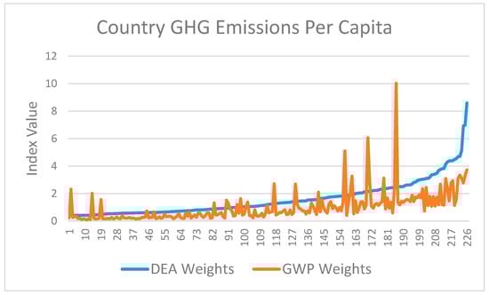 In this exercise, we construct a Composite Greenhouse Gas Index of emissions per capita based on DEA weights and compare it with a Total Greenhouse Gas Index of emissions per capita based on GWP weights. The sample size is 226. The two indices, each normalised by its mean value and ordered in ascending value of the Composite Index, appear in Figure 2.