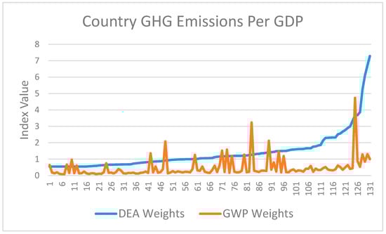 In this exercise, we construct a Composite Greenhouse Gas Index of emissions per GDP based on DEA weights and compare it with a Total Greenhouse Gas Index of emissions per GDP based on GWP weights. We have eliminated six outliers, reducing the sample size from 137 to 131. The six are the Democratic Republic of Congo in 1990, 2000, 2010, Mozambique in 2000, 2010 and Myanmar in 1990; all emitted suspiciously high levels of F gases, ten or more times the sample mean, and all assigned zero shadow values to F gases/GDP. The two indices, each normalised by its mean value and ordered in ascending value of the Composite Index, appear in Figure 3.