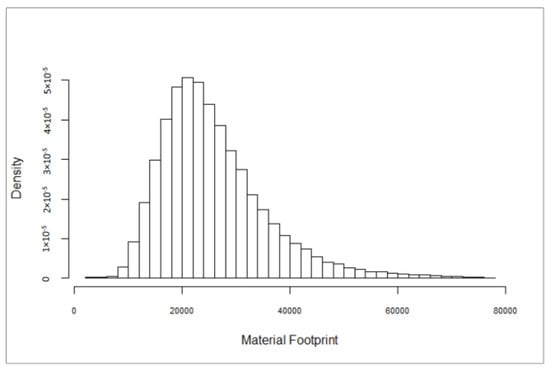 We collected data from an online survey application at ressourcen-rechner.de/?lang=en. This application can be used to calculate a person’s individual material resource use. Once their material resource use had been calculated, we asked users to provide additional socio-economic and socio-psychological information about themselves (see Table 1 for the relevant variables). The application was advertised on the Wuppertal Institute website, by independent online blogs on sustainable living, and in reviews of economic and product testing magazines. The application can be used for free; no incentives are involved, and participation is voluntary. A total of 49,037 persons participated in the survey between its launch on 25 February 2015 and 13 February 2017. After preparing the data and removing invalid and implausible responses, information provided by 44,514 users was analysed. The differing number of observations between single variables is due to implausible responses and missing data due to non-response. We censored the data on material footprints and lifestyle (trips, days on vacations and hours spent on hobbies) as well as on age, size of residence and number of children in the household at the 99th percentile. In other words, we excluded the highest one per cent of observations of the distribution in order to cope with outliers and implausible responses. We also considered scores of 0 for material footprints for mobility and consumer goods to be implausible, and excluded them from our analysis. As a result, the total average material footprint is 26 tonnes per person. In comparison, findings from a recent representative analysis of the material resource use in private households in North Rhine-Westphalia, Germany’s largest federal state, reported an average material footprint of between 30,992 kg and 31,721 kg in 2013 (p < 0.05), which is up to 23% higher than predicted in our study [15]. The distribution of the material footprint is close to normally distributed (Figure 1). The distribution of individual life satisfaction is skewed to the left (Figure 2). On average, respondents stated a life satisfaction of 7.3 on a scale from 1 to 10. This score is close to the life satisfaction in Germany determined by Enste and Ewers [14].