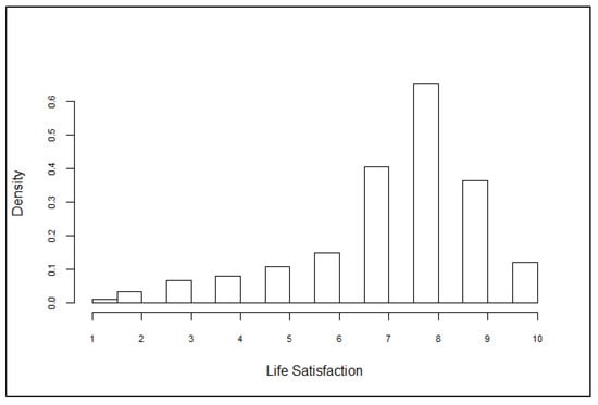 As indicated by the skewed distribution of life satisfaction (see Figure 2), we violate the assumption of normally distributed residuals of parametric t-tests. Accordingly, we transformed life satisfaction according to the Box–Cox transformation. Box and Cox [16] suggest transforming the response or outcome variable in order to improve the symmetry of the distribution of . To this end, a left-skewed distribution, such as with life satisfaction, needs its left tail pushed to the right and its right tail pushed to the left. Box and Cox define a suitable transformation as follows: