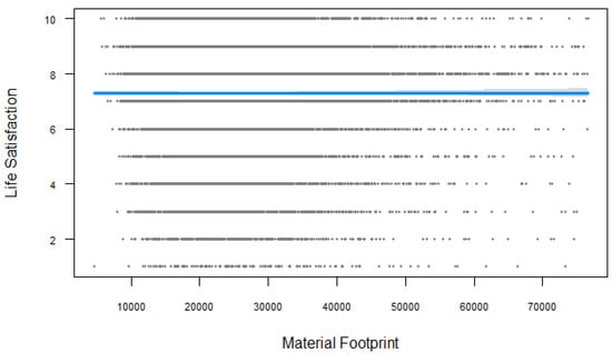 In Table 2, we present the results from regression analysis of the stepwise regression encompassing four successive regression estimates. The fourth model is the decisive, final model for assessing the relationship between resource use and life satisfaction. As we can see, the material footprint correlates significantly with life satisfaction throughout the stepwise regression analysis. The significant effect of the material footprint of leisure is a statistical artefact that dissolves as soon as additional covariates are introduced into the model (2). However, the correlation between the overall material footprint and life satisfaction is a robust, significant effect throughout Models (2) to (4). Interestingly enough, the effect of resource use on life satisfaction is negative. This means that as the material footprint increases, life satisfaction decreases. Our results support the recent findings by Ambrey and Daniels [6], who also established a negative relationship between environmental pressures and subjective well-being.