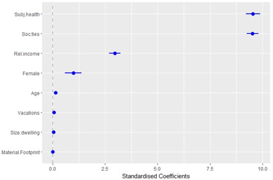 As expected, subjective health, satisfaction with social ties, and relative income have a significant influence on life satisfaction. The healthier they feel, the more satisfying respondents perceive their social ties to be; the higher respondents rank their household income compared to friends and families, the higher their individual life satisfaction. Social status based on occupational status has a significant effect. Unemployment had a positive impact on life satisfaction in Model (2). However, the significant influence of unemployment dissolves as additional personal covariates are introduced to Models (3) and (4). Eventually, social status based on occupational status has no robust, significant influence on life satisfaction. Nonetheless, we would have expected unemployment to have a significant negative influence on life satisfaction, as shown by Enste and Ewers [14]. This leads us to ask which the most relevant predictors for explaining life satisfaction are. In order to reveal and compare the power of predictors, we need to standardise our regression coefficients since we have to deal with different scales, ranging from quasi-metric Likert scales such as subjective health to metrics such as age and, above all, large-range material footprints.