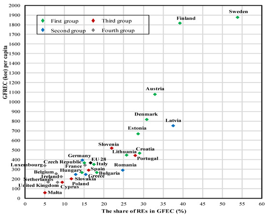 Directive 2009/28/EC proposed the share of energy from REs in GFEC as the reference index and the literature analysis added another index represented by GFREC per capita [