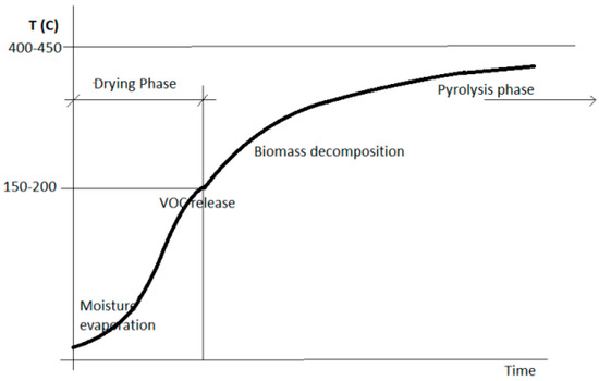 Microwave technology has recently emerged as one of the most promising methods of enhancing and accelerating chemical reactions, due to effective heat transfer profiles. It is therefore being adopted as one of the best technologies available in pyrolytic processes, since it reduces residence time and brings significant energy savings [9]. So-called microwave-assisted pyrolysis (MAP) technology is an alternative heating method presenting several advantages over conventional pyrolysis, including: uniform internal heating for material particles, since electromagnetic energy is directly converted into heat at the molecular level; ease of control due to process instantaneous response; simple set-up, facilitating its adaptation to large-scale industrial processes; reduced need for feedstock grinding; low cost, as microwave is a mature and energy-efficient technology. The different heating mechanisms allowed by microwave properties (heat diffuses from within the microwaved mass and not from its exterior) make MAP products retain different characteristics than those obtained with conventional heating. MAP develops according to two stages: drying and pyrolysis (Figure 1). Since water has excellent microwave absorbability, biomass shows high temperature rising rates during initial drying. As the temperature continues to increase, the biomass becomes less absorptive towards microwave radiation, and temperature rising rates slow down [13]. Masek et al. [14] also confirmed that in the case of MAP, pyrolysis of some feedstocks can occur at even lower temperatures than those reported for conventional heating.