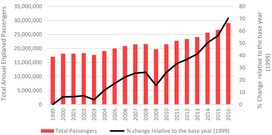 Copenhagen Airport’s total annual enplaned passengers (domestic and international) and the annual percentage (%) change relative to the base year (1999): 1999 to 2016. Source: data derived from [12,40,61,62,63,64].