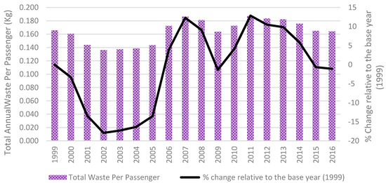 Total annual waste and the annual percentage (%) change relative to the base year (1999) at Copenhagen Airport: 1999 to 2016. Source: data derived from [12,40,61,62,63,64].