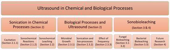 Figure 1 shows an outline of this review. In Section 2, we discuss the applications of ultrasound in chemical, and biological processes. Sonobioleaching is reviewed and discussed in Section 3 and Section 4.