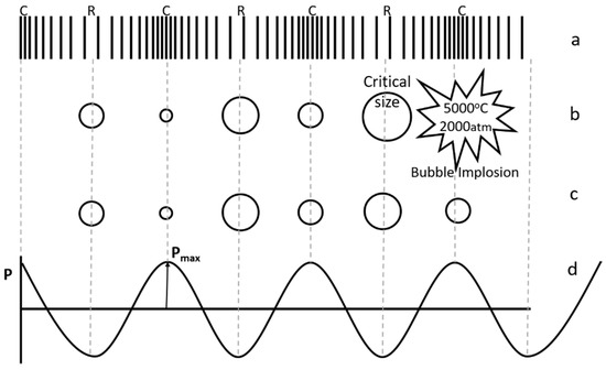 Hotspot theory, which is based on cavitation, is widely accepted in comparison with electrical theory [18,19,20]. When ultrasound propagates through any liquid medium, it compresses and stretches the molecular spacing in the medium (Figure 2a). Pressure (P) variation during compression (C, where P = +Pmax) and rarefaction/stretching (R, where P = −Pmax) can be represented as a sinusoidal wave function (Figure 2d). When the distance between the molecules of liquid exceeds the minimum molecular distance required to hold the liquid intact, cavitation bubbles containing liquid vapors and dissolved gases are formed. These bubbles increase in size with each cycle and implode after reaching a critical size during subsequent compression, leading to high temperature and pressure conditions (Figure 2b). This phenomenon, termed as cavitation, can be stable or transient, depending on ultrasonic intensity. Transient bubbles are formed at higher intensities and collapse violently after undergoing one or two acoustic cycles (Figure 2b), while bubbles formed during stable cavitation may or may not collapse after many cycles (Figure 2c). For sonochemical effects, transient cavitation is considered more important. Experimental estimates of temperature and pressure are in the range of 750–6000 K and about 500–1800 atm respectively [19,20]. High temperature and pressure conditions observed at the microscopic level provide the conditions necessary for the various reactions. Cavitation and chemical effects are not observed when the sonication intensity is lower than a minimum value, known as the cavitation threshold. A higher threshold intensity is also observed when there are no dissolved gases in the system [18].