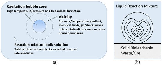 There are three main reaction sites during cavitation, namely bubble core, bubble vicinity and bulk solution [20]. As shown in Figure 3a, the formation of radical or excited molecules takes place within the bubble core, with temperature/pressure gradient, electrical field, shock waves and phase boundaries arising in the bubble vicinity. However, cavitation is different in a heterogeneous system, compared to pure liquids. Near a solid surface, bubble collapse becomes non-spherical, driving high-speed jets of liquid onto the surface (Figure 3b) which leads to shockwave damage at the surface [37]. In such systems, most of the available energy is transferred to the accelerating jet rather than the bubble wall, with this jet capable of reaching velocities of hundreds of meters per second. In addition, shockwaves created by cavity collapse in the liquid induces surface damage and the fragmentation of brittle materials. This impingement of micro-jets and shockwaves on the surface creates localized erosion, which is responsible for many of the sonochemical effects in heterogeneous reactions. This property of ultrasound can also prove useful in eroding passivating product layers, which are formed in various bioleaching systems. For instance, in spent catalyst bioleaching (without ultrasound) using Acidithiobacillus ferrooxidans, poor Mo leaching is attributed to the refractory nature of MoS2 and the formation of an elemental sulfur layer [38,39]. In this example, the application of ultrasound may enhance bioleaching by providing extreme (high temperature and pressure) conditions and eroding the product layer.