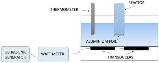 A schematic representation of the experimental set-up used for the sonobioleaching study is shown in Figure 4. An ultrasonic/signal generator is connected to a wattmeter for power measurement and piezoelectric transducers are connected at the bottom of a water bath. Aluminum foil was reportedly used at the bottom of the reaction vessel to act as a transmitter.