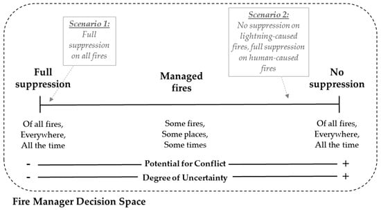 We conceive of fire management as occurring along a continuum, with full suppression in all locations on the landscape at one end of the continuum and no suppression at any location at the opposite end of the continuum (Figure 1). In between lies a rich array of managed fire options, consisting of those where fire suppression actions are taken based on location of the fire, time of season, cause of ignition or other factors. These locations and times can be evaluated before the ignition occurs through a spatial fire planning process [,]. Notice that “no fire” is not an option on the continuum: although many land management agencies have at times during their histories tried to eliminate fire from the landscape, they have not been successful []. Thus, full suppression is as close to the “no fire” end of the continuum as fire response can feasibly come. Full suppression may be the most appealing choice for many land managers even in locations where increasing area burned is ecologically desirable: the potential for conflict increases where unsuppressed fires may cross boundaries into other land ownerships and the degree of uncertainty can increase, as well, since unsuppressed fires are likely to remain active on the landscape for longer periods of time under varying weather conditions [].