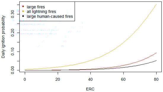 Probability of ignition given Energy Release Component (ERC) for large fires, all lightning fires and large human-caused fires. The vertical distance between the red “large fires” curve, and the black “large human-caused fires” curve represents the probability of ignition of large lightning-caused fires.