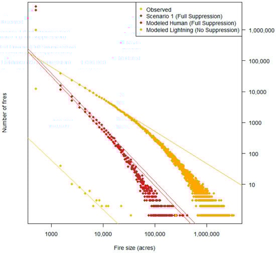 We plotted the fire size distributions of observed fires, modeled large fires under full suppression (the results of Scenario 1), human-caused large fires under full suppression (a component of Scenario 2) and all lightning fires with no suppression (the other component of Scenario 2). We calculated the slopes in log10-log10 space using Kendall’s tau regression as this method is less sensitive to outliers []. We used a bin size of 404.7 ha (1000 acres). The smallest bin in a frequency-magnitude distribution is overpopulated because data spanning several orders of magnitude are compressed into this bin, while the largest bins are underpopulated due to the rarity of the largest events, causing the distribution to curve slightly [,]. Therefore, we fitted the regression lines to fires of sizes 404.7–8093.7 ha (1000–20,000 acres) for modeled fires and 404.7–3237.5 ha (1000–8000 acres) for observed fires. A similar slope coefficient indicates similarity in the proportions of fires in each size class, regardless of the intercept (which is sensitive to the total number of fires; that number is higher in the modeled runs, which operate over 10,000 modeled years, while the observed record extends for only 22 years). As FSim was designed to primarily simulate large fires, we used parameters from observed fires in order to estimate how many small fires were missing from FSim’s output. As mentioned before, these fires do not contribute meaningfully to area burned; thus, they are not simulated in FSim, but we wanted to include them in the fire size distributions for completeness. In order to estimate the number of small fires that did not ignite in FSim and would thus be missing from the fire size distribution, we assumed that the total annual number of ignitions would be the same in the modeled scenarios as in the observed record. Thus, we can infer the number of missing small fires and add these to the smallest bin in our fire size distributions. In addition, from this methodology, we were able to estimate the percent of ignitions that grow large in both the observed record and model results (Table 2).