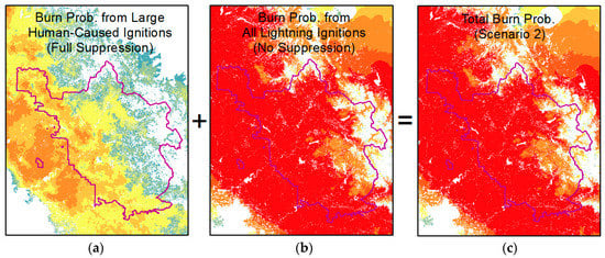 Annual burn probability resulting from: (a) human-caused large fire ignitions; (b) all lightning ignitions; and (c) their added result, the output from Scenario 2. The burn probability scale is identical to that in Figure 5.