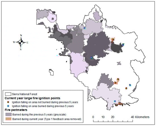 The use of modeling scenarios such as those presented here can help inform land management decisions. Our results provide further support for the potential for wildland fires to act as a fuel treatment, in order to reduce the potential for ignition and spread of future fires, especially where the landscape may benefit from fire, or where a burned area may serve as a barrier to protect highly valued resources such as municipal watersheds [,,]. While this work demonstrates the potential to leverage managed lightning fires as a restoration tool, many questions remain about where and when such fires would be likely to meet ecological goals in terms of acreage burned, fire severity and effect on highly valued resources. Because stand structure in the U.S. West has changed as a result of fire suppression and timber harvest, restoration of stands via prescribed burning perhaps accompanied by mechanical fuel treatment where feasible may be warranted []; however, recent observations indicate that fire alone may be sufficient to restore stands to a desirable structure over the long term, though this may require more than one fire [,,]. Fire severity in the Sierra Nevada is strongly influenced by relative humidity and time since fire, among other factors, suggesting that choices about when and where to utilize managed lightning fires may depend on both weather and location []. Previous work has provided a framework to evaluate the potential benefit and loss from the next fire []; the work presented here begins to incorporate the temporal dimension of feedbacks in burned area, translating to an enhanced ability to balance tradeoffs between short- and longer-term risks.