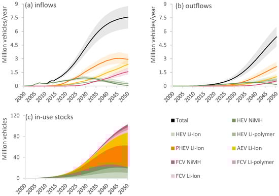 Inflows (a); outflows (b); and in-use stocks (c) of alternative energy passenger vehicles in the US, 2000–2050 by technology. Notes: panels (a,b) show the three FCV types aggregated to a single category for clarity. The flows panels (a,b) present 5% and 95% confidence intervals calculated with Monte Carlo simulations (see Supporting Information for details). HEV—hybrid electric vehicle, PHEV—plug-in hybrid electric vehicle, BEV—battery electric vehicle, FCV—fuel cell vehicle. Note the different ordinal scales of the flows and stocks figures.