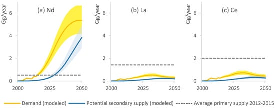 In comparison, lanthanum (Figure 2b), cerium (Figure 2c), praseodymium, terbium, gadolinium, and erbium (Figures in the Supporting Information) have similar inflow and outflow trajectories to each other. They are all used in small amounts in NIMH batteries in a mischmetal alloy [], and their inflows peak and decline in the early 2030s as other battery technologies overtake NiMH. By 2050, the demands for these materials decline down to 2020 levels. Outflows of these materials peak in the 2040s and are insufficient as a supply source on their own. However, if primary production resumed at 2012–2015 levels, demands would not exceed 50% of this hypothetical primary supply even at their peak (note that terbium and erbium were not produced in the US, and are considered noncrucial trace elements in mischmetal). A theoretical combined primary and secondary supply potential of these materials would far exceed demands.