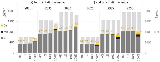 The consequences of technological change on the demand and supply of critical materials is illustrated by the introduction of a recently developed aluminum–cerium–magnesium (AlCeMg) alloy [,] in two scenarios. In the Fe substitution scenario set, a rate (1–100%) of the AlCeMg alloy is substituted for cast iron in internal combustion engines of cars sold from 2025 onwards. There is no technical restriction to substitute iron only in internal combustion engines and not in other components. Rather, this is a modeling choice to explore consequences related to specific vehicle technologies—in this case, only hybrids and plug-in hybrids. In contrast, in the Al substitution scenario set we substitute the AlCeMg alloy at a rate for cast aluminum, up to the entire aluminum in all vehicle components, in all vehicle technologies. The formulas in Table 1 are used in these two scenarios.