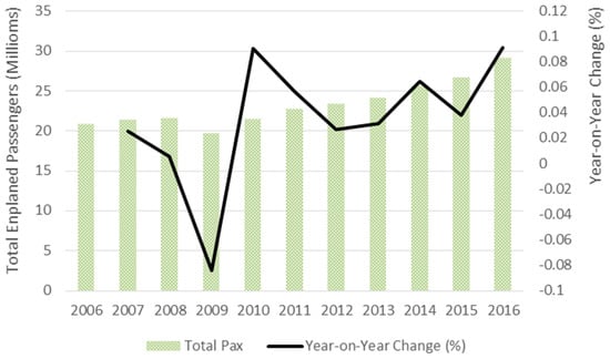 Figure 1 shows the total annual passenger traffic (domestic and international) and aircraft operations at Copenhagen Airport from 2006 to 2016. In 2009, the total annual passenger volumes declined by around 8.4%. However, during 2009, the airport recovered the traffic lost following the Sterling Airlines bankruptcy in 2008. This growth came from services operated by Norwegian Air Shuttle, Transavia, easyJet, and Cimber Sterling (Figure 1) []. In 2014, Copenhagen Airport handled 25,627,093 passengers (Figure 1), which was the first time in the airport’s 90-year history that the total annual enplaned passengers surpassed 25 million passengers travelling through the airport []. More than 29 million passengers passed through Copenhagen Airport in 2016. This represented a 9.1% increase on 2015 passenger volumes (Figure 1). The growth recorded in 2016 was driven by an additional 2.3 international travellers using the airport [].