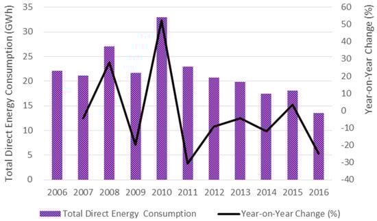 Figure 2 presents the total annual direct energy consumption at Copenhagen Airport for the period 2006 to 2016. The sources of direct energy are gasoline, diesel, heating oil, and natural gas. Natural gas is used for local production of central heating and power for Copenhagen Airport’s power grid. The generation of power using natural gas was discontinued at the airport in mid-2012 []. As can be observed from Figure 2, throughout this period the total annual direct energy consumption peaked in 2010 and has since declined from 2011 to 2013. Factoring in the growth in passenger numbers for the airport, there is a significant reduction in the energy consumption per passenger since 2010.