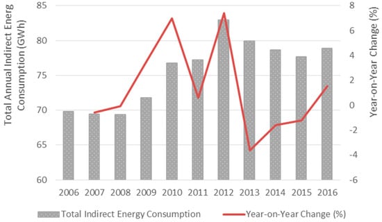 Copenhagen Airport’s total indirect energy consumption and year-on-year change (%): 2006–2016. Source: data derived from [,,,].