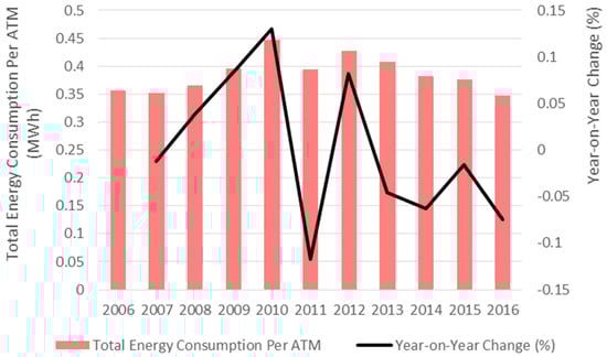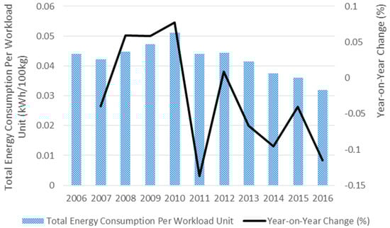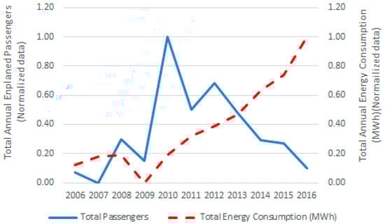 Figure 6 presents the total annual energy consumption per passenger unit of traffic WLU at Copenhagen Airport for the period 2006 to 2016. As noted earlier, one work load unit (WLU) is equal to one terminal passenger and their baggage or 100 kg of air cargo [,]. As can be observed in Figure 6, the total annual energy per passenger traffic workload unit (WLU) increased over the period 2007 to 2011. Most importantly, the total energy per passenger traffic work load unit (WLU) has declined from 2011 to 2016, this is despite a substantial increase in the number of passengers using the airport over this period.