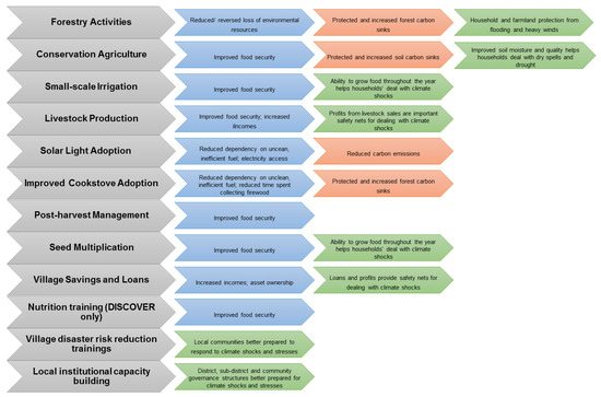 Secondly, projects’ comparability meant the procedural justice implications of their different implementation methodologies could be isolated and analysed. This allowed for the development of recommendations to inform current and future policy and practice. Both projects operated over identical time periods (2011 to 2016). They implemented identical packages of activities. Projects aimed to achieve a range of development goals and help households adapt to the consequences of: dry spells and drought; heavy rains and flooding; and heavy winds. Project activities incorporated a mitigation component by avoiding or reducing greenhouse gas emissions (Figure 1). Households perceived as the most vulnerable—female-headed, elderly, extremely resource-poor, and those with disabled or chronically ill adults—were primarily targeted by the projects [31,50].