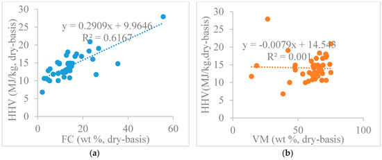 Correlation is evaluated to measure the strength of the association between the factors (e.g., FC, VM, ash) and response variables (e.g., HHV). As shown in Figure 1, there is a relatively strong linear correlation between the HHV and FC (R2 = 0.6167) while only a moderate correlation exists between the HHV and ash (R2 = 0.3593) with the current PW database. However, Sheng and Azevedo [6] found a different phenomenon for biomass, in that there exists a significant correlation between HHV and ash (R2 = 0.625) while only a trend exists between the HHV and VM (R2 = 0.307). In addition, Akkaya et al. [55] observed a linear relationship between the HHV and two components (VM and FC), as well as a stronger non-linear dependence for percentages of other two components (M and ash) with coal samples. Compared with biomass and coal samples, the correlation between proximate analysis components and HHV for PW samples is significantly different. This suggests that the existing correlation of proximate-based models for solid fuels, such as biomass and coal, are not appropriate for estimating the HHV of PW samples. Thus, fifteen new regression models are proposed to correlate the HHV and proximate analysis components of PW samples.