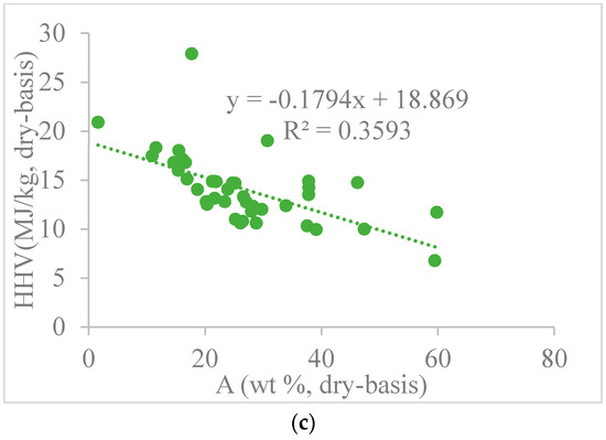Relationships between HHV and composition of individual proximate analysis components: (a) Scatter Plot of fixed carbon (FC) along with HHV results; (b) Scatter plot of volatile matter (VM) along with HHV results; (c) Scatter plot of Ash (A) along with HHV results.