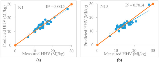 Figure 2d–f indicate that the predicted HHV from existing proximate-based models are far away from the line of HHVpredicted = HHVexperimental (orange lines in Figure 2) and therefore not applicable in predicting the HHV of PW samples. On the other hand, the results show most of the estimated HHV results from new regression models (N1, N10 and N15) are close to the line of HHVpredicted = HHVexperimental, indicating good accuracy for HHV predictions of PW samples. The results further confirm that the new regression models have better accuracy than existing proximate-based models in predicting the HHV of PW samples. It is especially apparent that the predicated points from the best-fit regression model (N15) are close to the measured values while slightly over-predicting or under-predicting the HHV at different points in the curve.