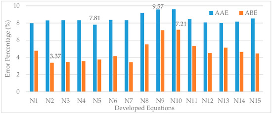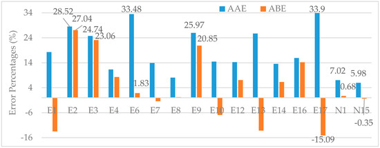 Comparison of error percentages (both AAE and ABE) between existing proximate-based models (E1–E17) and new regression models (N1, N15).
