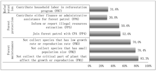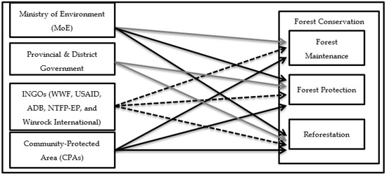 - Forest conservation: it can mean anything from intensive timber production to total preservation, but forests would not be permanently converted to another use such as agriculture [36,37]. Some studies define forest conservation as ‘forest maintenance’ activities through sustainable extraction behavior [16,29,38]. Many authors regard ‘forest conservation’ as forest protection activities, including forest patrolling and financial supporting to rangers [14,39]. Another author adds that ‘reforestation’ is a significant activity for forest conservation [26]. Therefore, this study regards ‘forest conservation’ as activities of forest maintenance, forest protection, and reforestation.