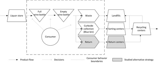 In this context of new business and product flow models, the ability to compare both economically and environmentally multiple product flow strategies is undoubtedly relevant to decision-makers willing to progress towards CE goals [2,3]. A difficult aspect of the analysis of new strategy introduction is the human factor. It is indeed difficult to predict how people may react when faced with various options, which, in turn, makes it difficult to assess technical feasibility and profitability. In order to address this issue, computer simulation offers a compelling analytical approach since it enables both macro and micro modeling capabilities in a risk-free environment [4]. This paper proposes a simulation model of consumer behavior for end-of-life product flow to work towards finding more sustainable end-of-life product flow strategies. It is applied to a case study of Quebec’s wine bottle potential deposit-return scheme that is currently being looked at by policy-makers. The simulation model can be used to estimate the percentages of products that are sent in each end-of-life option according to various parameters such as the deposit value, the consumer-to-depot maximum distance, and the proportion of the population owning a vehicle. The model is calibrated and validated with various independent data sources. Merging these data sources in one single model enables the emergence of behavior tendencies that would not be observable without the consumer behavior simulation model.
