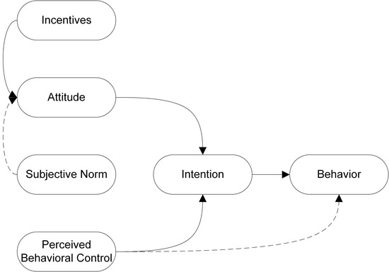 In the theory of planned behavior, inputs are generally categorized and gathered into constructs. These theoretical artifacts are usually a combination of factors affecting the output of the model that have been, or could be, empirically validated [45]. In his original TPB framework, [28] suggested that behavior is influenced by intentions and perceived behavioral control (PBC), while intention would be defined by the constructs of attitude, subjective norm and PBC. The proposed model uses the same key concepts, plus an incentive construct, as shown in Figure 2.