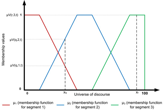 As illustrated in Figure 3, every segment has a membership function µs that delineates the shape of the segment. The universe of discourse (UOD) X, referring to environmental concerns, has values of xi,t ranging continuously from 0 to 100. The shapes seamlessly blend into one another, creating smooth transitions between the segments.