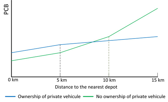 The results of a provincial survey [48] suggest that the intention to bring back the bottles generally decreases as the distance to the nearest depot increases. As it can be seen in Figure 4, there are two piecewise linear functions, one for each type of transport, where the different sections represent the three distance brackets. In equation 6, a and b are parameters calibrated with the survey data while d is the distance to the nearest depot, a characteristic randomised for each agent based on the simulated scenario. db stands for the distance brackets. Therefore, the PBC is equal to the opposite of the perceived cost of the behavior (PCB). Similar findings are presented in [49], where increasing travel costs can reduce the intention to visit drop-off centers.